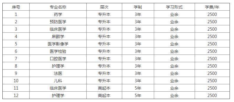 成人教育高起本層次設(shè)有臨床醫(yī)學(xué)、護(hù)理學(xué)等2個(gè)專業(yè);專升本層次設(shè)有臨床醫(yī)學(xué)、護(hù)理學(xué)、醫(yī)學(xué)影像學(xué)、醫(yī)學(xué)檢驗(yàn)、麻醉學(xué)、口腔醫(yī)學(xué)、藥學(xué)、藥物制劑、預(yù)防醫(yī)學(xué)、法醫(yī)學(xué)、生物技術(shù)、生物工程、生物醫(yī)學(xué)工程、應(yīng)用心理學(xué)、公共事業(yè)管理、信息管理與信息系統(tǒng)等16個(gè)專業(yè)。